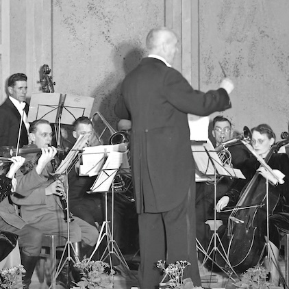 Jousin, puhaltimin ja yhdellä kosketinsoittajalla varustettu parikymmenpäinen sinfonietta pitää kapellimestari Kiltilän johtamana juhlakonserttia Suojeluskuntatalossa (nykyinen Sininen Talo) 1940–luvulla. Sotilasviulistit lienevät rintamalta lomalla. Kyseessä on vuonna 1923 perustettu Salon Amatööriorkesteri. Sellisti on rouva Lumilla Vilhonen. Kuva: Salo-Uskelan seuran arkisto
