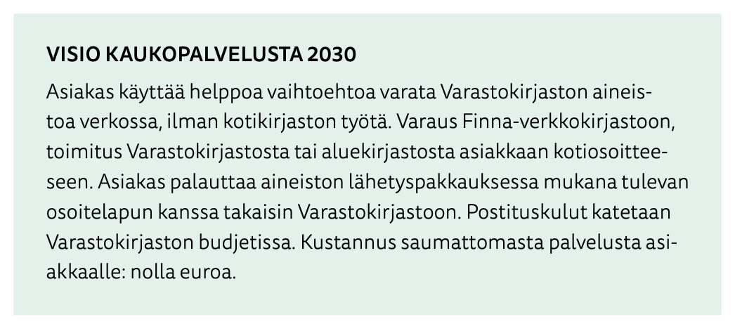 Kirjoitin kaukopalvelun maksuttomuudesta monelta kantilta kirjaan Maagisessa paikassa – Musiikkikirjastojen tuntematon tulevaisuus (2021). Visiossani aineistovarauksen kustannus asiakkaalle on nolla euroa. Visio on yhä mahdollinen jos luovumme nykyisistä kaukopalvelumaksuista emmekä aseta lainkaan uusia. Vapaan tiedon ja kulttuurin rinnalla voittavat kaikki: asiakkaat, kirjastot ja Varastokirjasto. Jotta pääsy kulttuurin ja tiedon ääreen on vapaa tulevaisuudessakin, tulee Varastokirjaston maksuton kaukopalvelu ja artikkelikopiopalvelu sekä maksuton aineistolähetys säilyttää ennallaan.