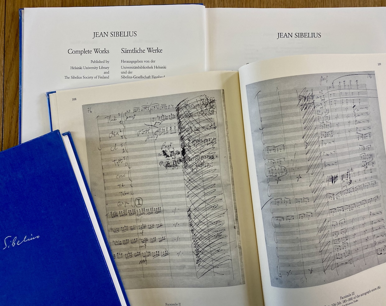 Projektissa Jean Sibelius Works (JSW) julkaistaan kriittisiä laitoksia läpi Sibeliuksen koko tuotannon. Kuudennen sinfonian op104 aukeamalla (Breitkopf & Härtel 2021) esillä faksimile-sivut II ja III. Kuva: Tuomas Pelttari