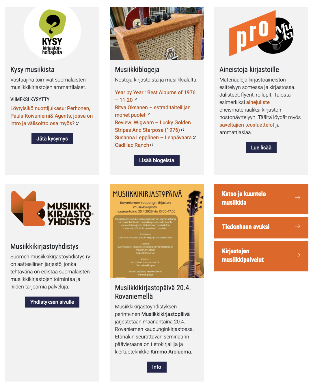 Etusivun alusta löydät kuvitetut verkkojulkaisut Levyhyllyt ja Musiikki kuuluu kaikille. Näiden julkaisujen omaa ilmettä olemme uudistaneet jo aiemmin, ja nyt aktiiviset blogit pääsevät esiin kolmella keskeisellä kuvanostolla. Etusivun keskivaiheilta löydät myös tiivistetyt kuvailut näiden foorumeiden sisällöstä, tutun infokarusellin Musiikin ytimessä läheltä. Jos karusellin syöte on otettu käyttöön seudullasi, niin infot löytyvät myös verkkokirjastosi musiikkisivulta.