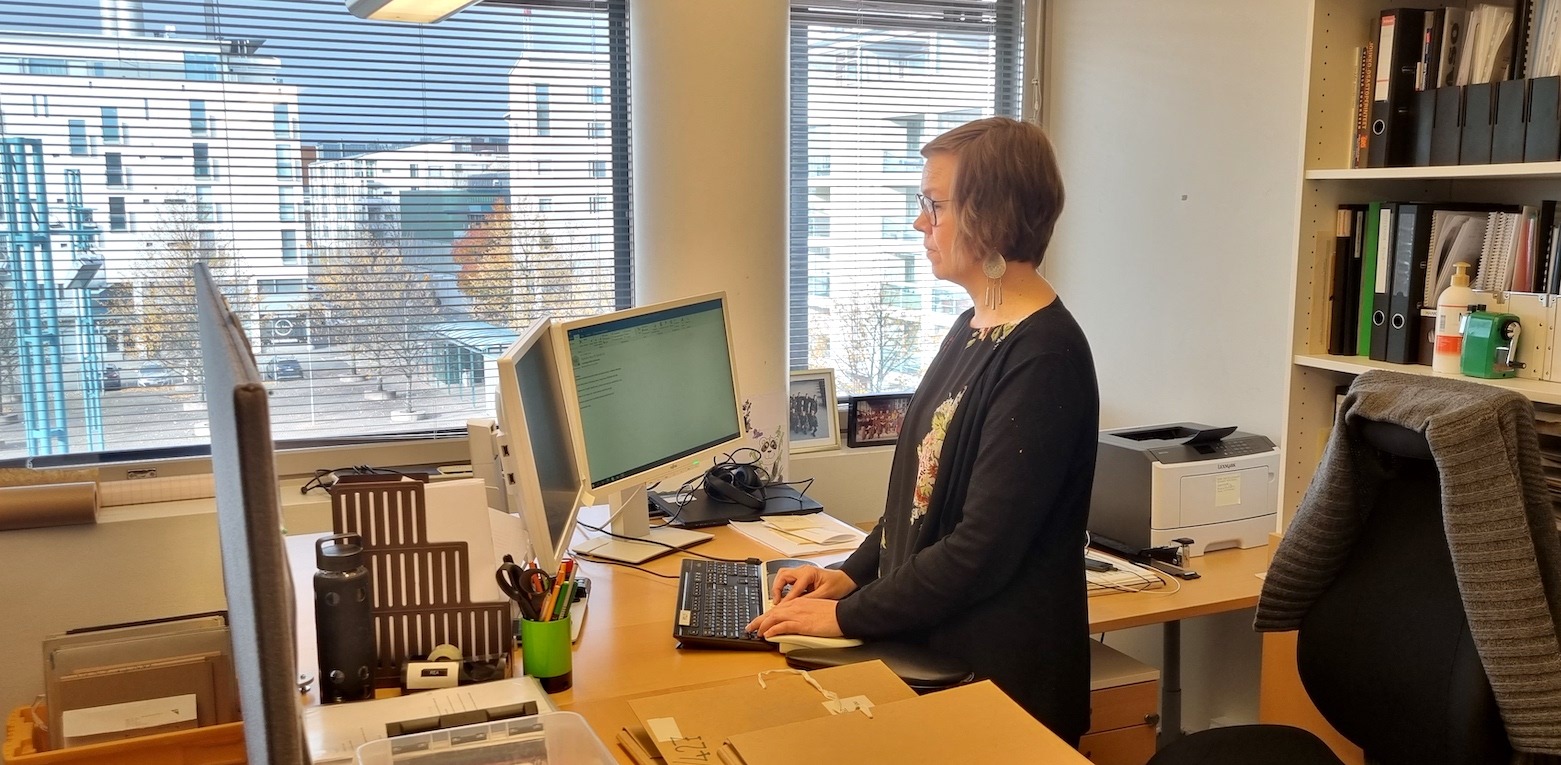 Olen saanut työhöni kuuluvat eri osa-alueet lähemmäksi toisiaan nykyisissä tiloissamme Helsingin Konservatoriolla. Tärkeimmät työpisteeni nuottiarkisto, nuotiston työskentelyhuone kopiokoneineen sekä oma toimisto nuotinkirjoitus- ja kuvankäsittelyohjelmineen ovat säällisen välimatkan päässä toisistaan. Moneen asiaan on helpompi ja mukavampi ryhtyä, kun työpisteet ovat lähellä toisiaan.
